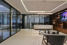 Divisória piso teto com maior robustez do tipo saque frontal, possui quadros de alumínio entre vidros sendo a linha com maior gama de opções, podendo mesclar vários tipos de modulações em um único tipo de divisória.